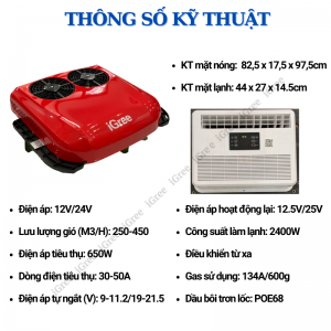 Điều hòa âm trần 2 quạt iGree 12V/24V là lựa chọn tối ưu nhất cho xe tải lớn, xe đầu kéo và xe container, mang lại khả năng làm mát vượt trội, vận hành êm ái và tiết kiệm nhiên liệu.