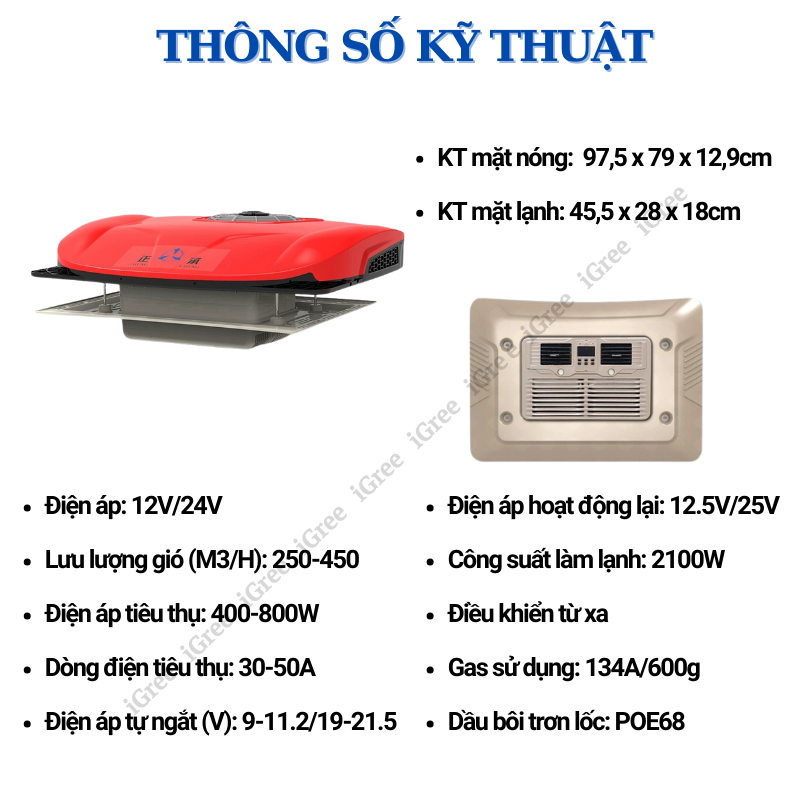 Công suất làm lạnh 2100W, chỉ tiêu thụ 400–800W điện, giúp cabin giảm nhiệt nhanh trong vài phút mà không hao điện ắc quy đáng kể.